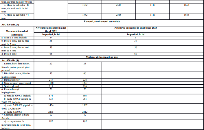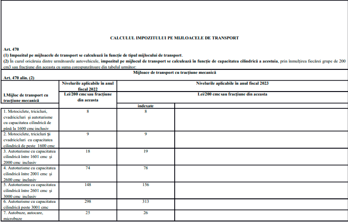 Referitor la impozitul pe mijloacele de transport, s-au adoptat următoarele modificări pentru anul 2023: