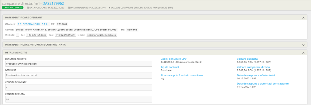 De asemenea, în același anunț se menționează că au fost achiziționate produse precum: perdele de lumini digitale, țurțuri (albi și albaștri), cabluri de alimentare, plase.