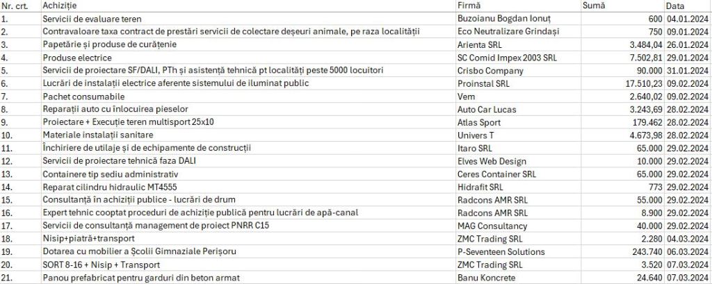 Primăria comunei Perișoru, condusă de Cătălin Bucur (PSD) a încheiat în primele trei luni ale acestui an 32 de atribuiri directe, potrivit datelor obținute din Sistemul Electronic de Achiziții Publice (SEAP). În total, acestea însumează 1.003.212 lei. De asemenea, una dintre achiziții, în valoare de 243.740 de lei, a fost suportată din bani europeni, în timp ce restul atribuirilor directe au fost plătite de la bugetul local.